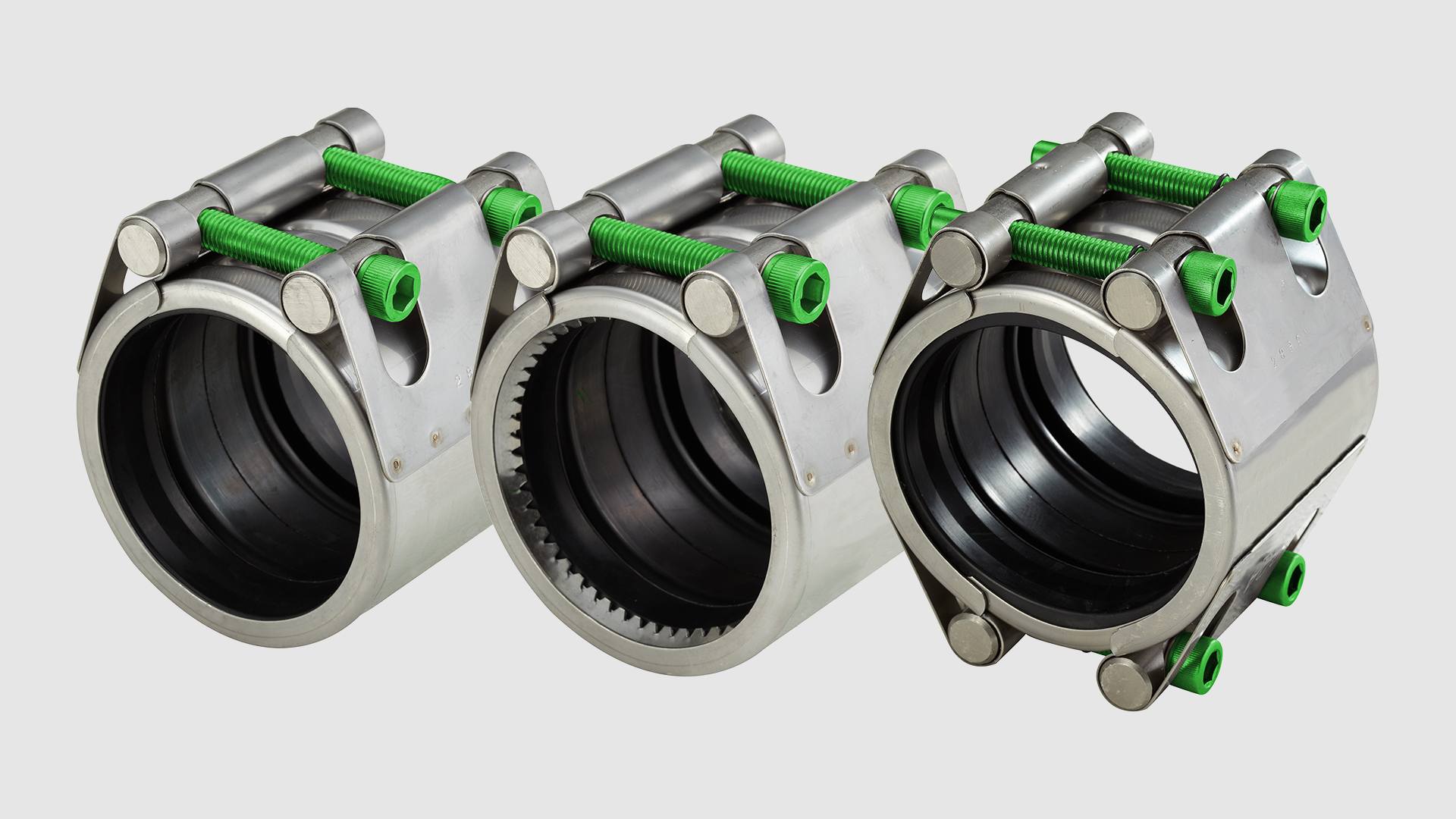 Repico® couplings offer progressive sealing, which means that when the internal pressure increases, it also increases the pressure on the sealing lips and they are thus pressed against the pipe. The tensile Grip couplings also offer progressive anchoring, which means that when the internal pressure increases, the support ring is pushed outwards forcing the grip ring to grip deeper into the pipe surface.